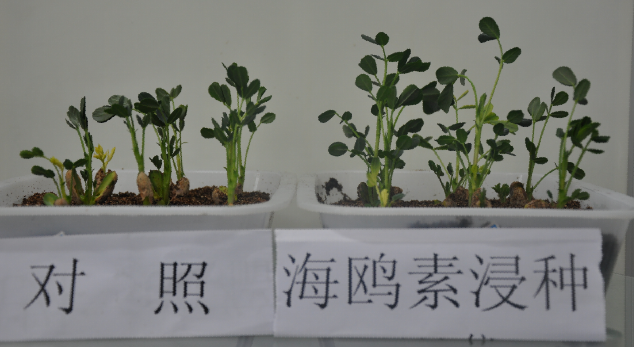 结果发现,花生、小麦的对照组与壳寡糖组存在显著差异,加壳寡糖组小麦、花生株高明显增高,叶子生长茂盛,茎明显增粗。说明壳寡糖可以促进作物的生长发育。壳寡糖促进植物生长主要是由于诱导了生长素(IAA)的合成,生长素信号传入植物体内起生长调节作用,激活植物多种生长发育基因表达,合成利于植物生长的生物活性物质,最终促进了植物的生长发育。