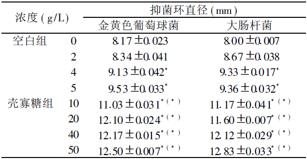 壳寡糖对金黄色葡萄球菌和大肠杆菌的抑菌环直径