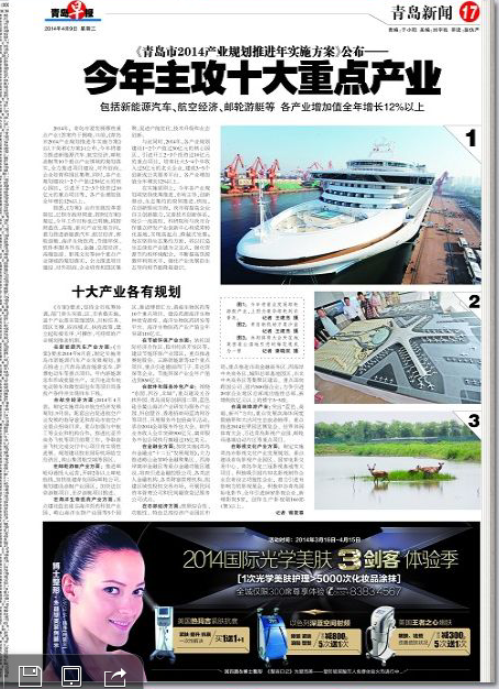 2014年4月9日青岛早报刊登了:《青岛市2014产业规划推进年实施方案》公布-----今年青岛主攻十大重点产业的重大新闻。其中,在海洋生物医药产业方面,我司被列为2014年青岛主攻十大重点项目之一。