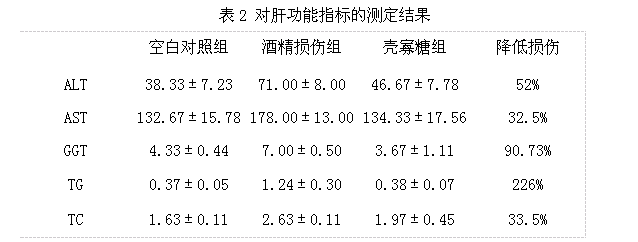 结果表明:壳寡糖能够显著改善酒精性肝损伤小鼠的血液生化指标,与酒精损伤组对比,壳寡糖显著降低血液中 丙氨酸氨基转移酶(ALT)、天门冬氨酸氨基转移酶(AST)、γ一谷氨酞基转移酶(GGT)、甘油三酯(TG)、总胆固醇(TC)等活性。壳寡糖对酒精性肝损伤有保护作用。