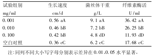 由此可知,褐藻寡糖对杏鲍菇菌丝体生长速度、菌丝体生物量、纤维素酶活性具有促进作用,低浓度的试验组较高浓度的试验组的促进作用明显。