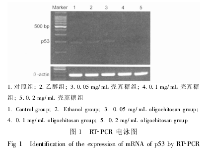 为解释壳寡糖保护L02细胞抵制乙醇的损伤,检测了基因p53的变化情况,如图1所示,壳寡糖能够明显下调p53基因的表达