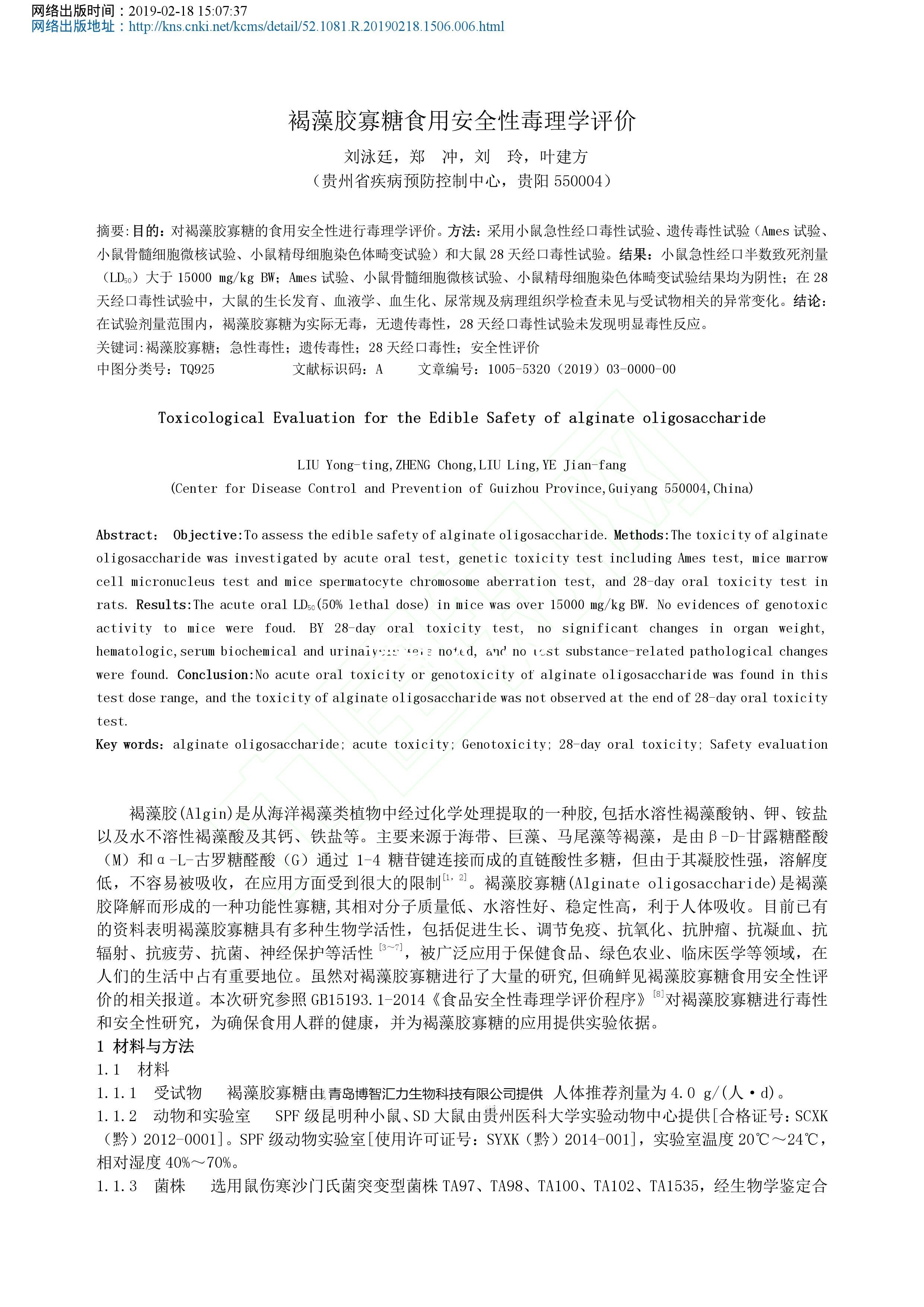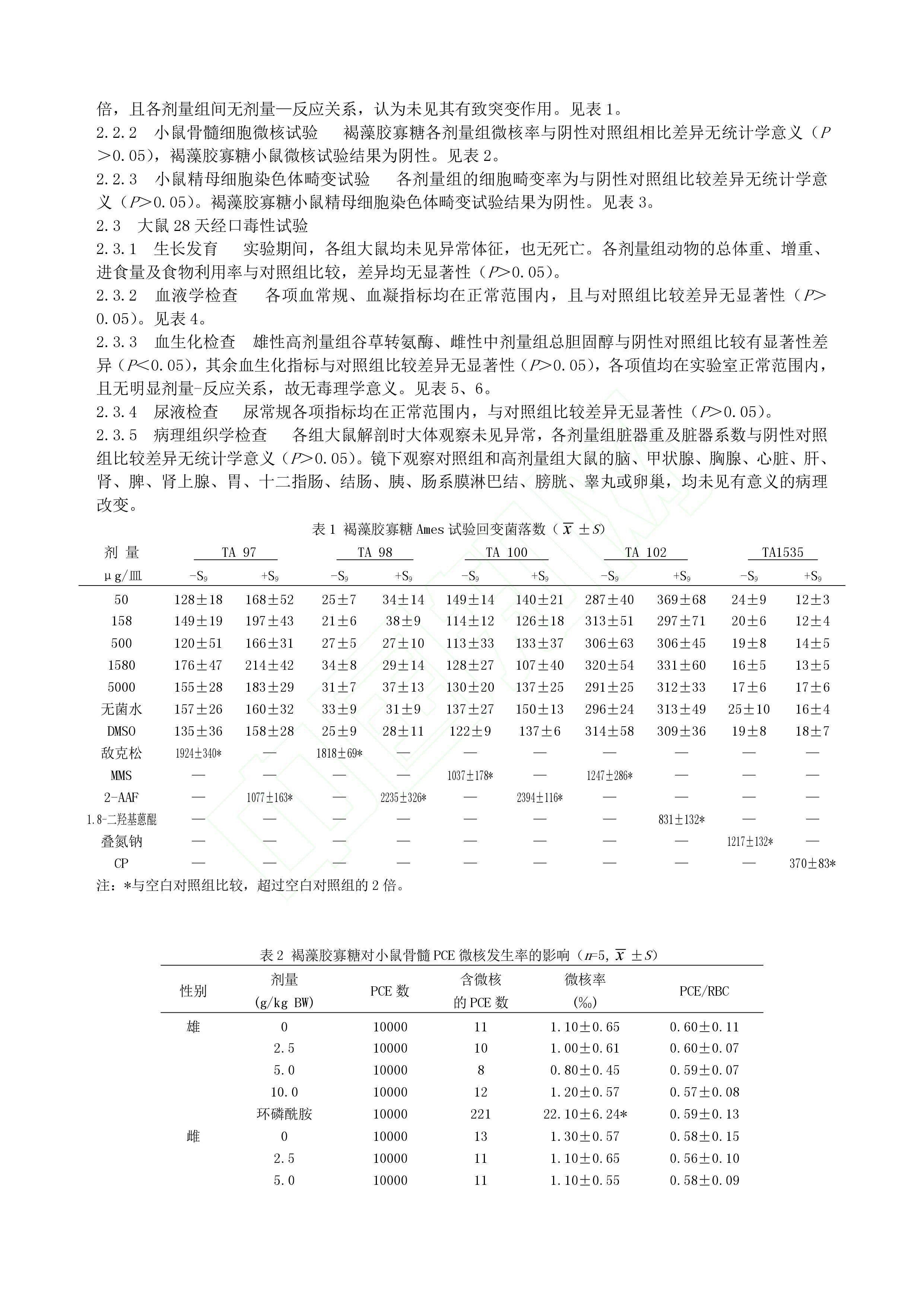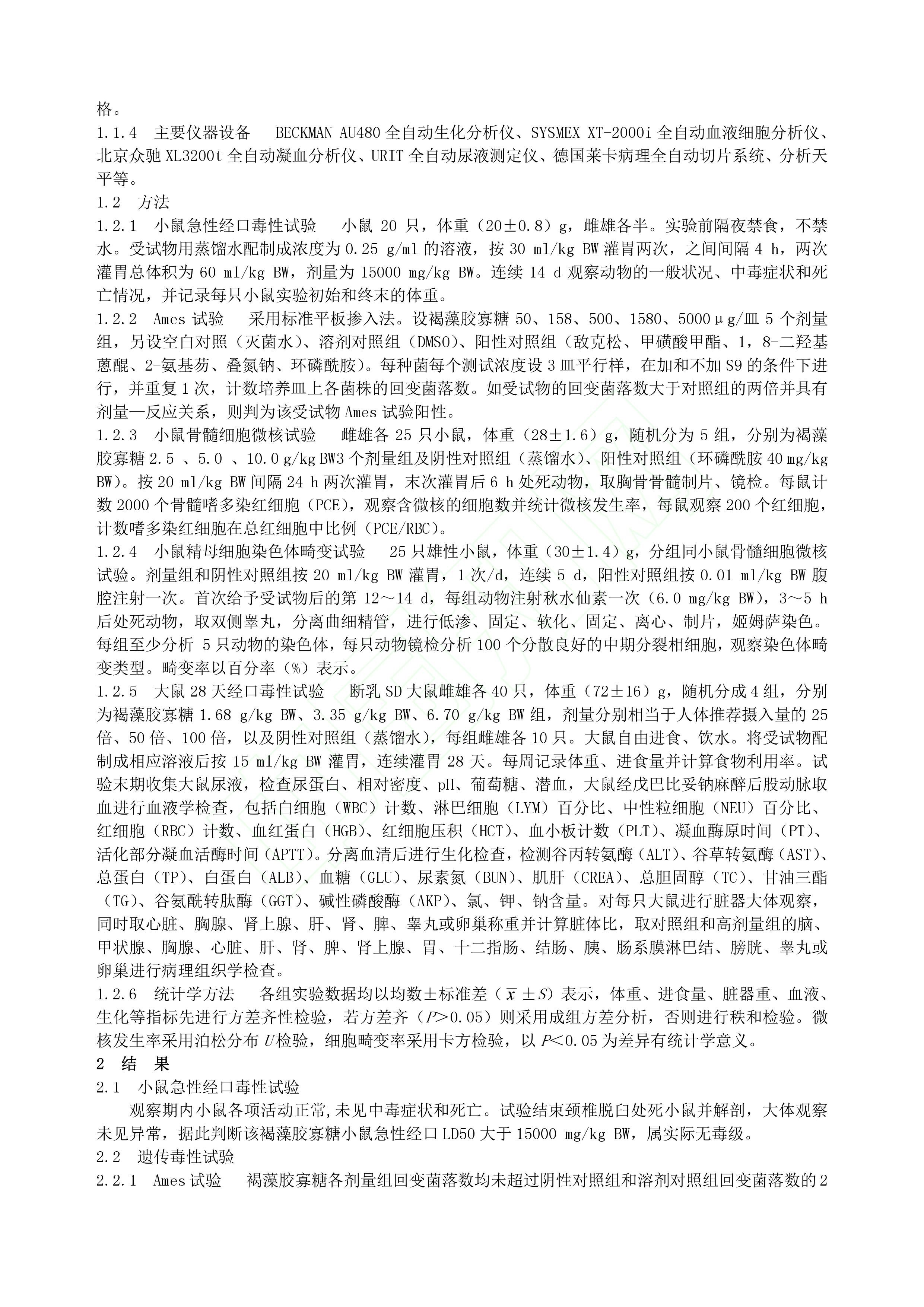 结论:在试验剂量范围内,褐藻胶寡糖为实际无毒,无遗传毒性,28 天经口毒性试验未发现明显毒性反应。