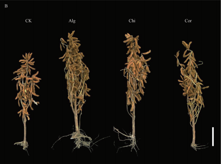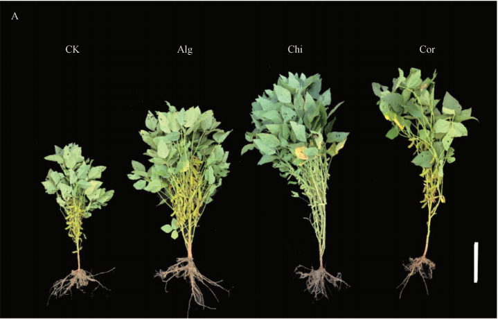 注: A: 大豆始粒期(R5) ; B: 大豆完熟期(R8)。选取各植物生长调节剂中浓度( MC) 喷施大豆叶片处理中,具有代表性的植株进行拍照 CK-对照 Alg-褐藻寡糖 Chi-壳寡糖 Cor-冠菌素