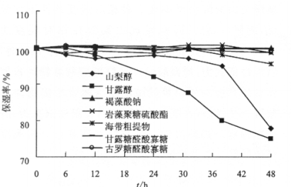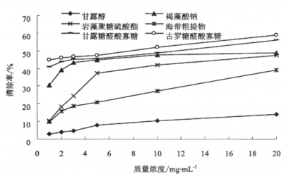 通过以常用的化妆品保湿剂山梨醇与甘露醇做对比实验,发现海带粗提物、褐藻酸钠、古罗糖醛酸寡糖及甘露糖醛酸寡糖具有较高的吸湿性与保湿性,其中寡糖的分子量低,具有渗透作用强的优势。古罗糖醛酸寡糖、甘露糖醛酸寡糖、褐藻酸钠及岩藻聚糖硫酸酯对超氧阴离子和羟基自由基均有较强的清除作用。因此,海带粗提物、甘露醇醛酸寡糖、古罗糖醛酸寡糖、岩藻聚糖硫酸酯与褐藻酸钠均可成为化妆品的天然保湿剂和抗氧化剂。
