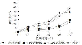 实验以新疆青皮核桃为研究对象,采用1%壳聚糖、0.20%壳寡糖、1%水杨酸对青皮核桃进行浸泡处理,以蒸馏水浸泡作对照,在贮藏温度 0~1 ℃,相对湿度 90%~95%条件下进行贮藏,定期测定青皮核桃腐烂率、失重率,以及总酚、总黄酮、丙二醛的含量及 POD 活性。