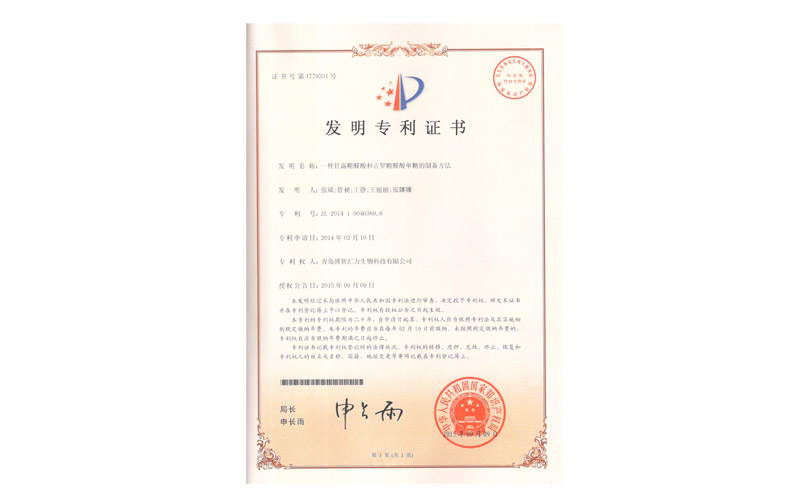 专利证书-一种甘露糖醛酸和古罗糖醛酸单糖